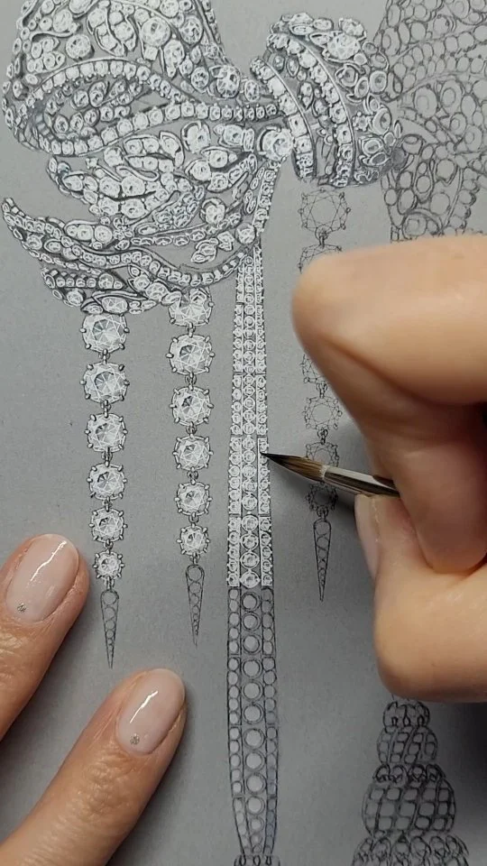 Jewelry gouacheis a traditional drawing technique using gouache paint that enables precise rendering of jewelry before fabrication. By combining pigments and water, gouache highlights proportions, volumes, stone colors, metal shine, and light effects. It's a universal visual language in high jewelry, used both to communicate creative ideas and to captivate clients or guide artisans during fabrication. This traditional European watercolor technique is still a crucial step in all high jewelry creation.